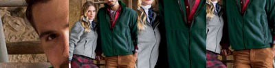 matching flat knit collar; contrast colour neck tape; contrast inner placket; contrast side inserts; contrast piping at front and back shoulders and sleeves; contrast two-needle decorative stitching;