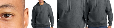 8.4-ounce, 80/20 ring spun cotton/poly 75/25 ring spun cotton/poly (Ring Spun Sport Grey) Brushed interior and a 100% ring spun cotton face Two-piece dyed-to-match jersey fabric-lined hood No drawcords Double-needle hem and topstitching on outside of hood seam Front pouch pocket 1x1 rib knit with spandex cuffs and bottom band Classic fit, seamless body Recycled, high-performing black tear-away label
