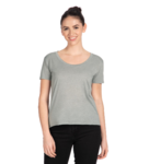 Next Level Women's 3.5 Ounce Festival Scoop Neck T-Shirt. 65/35% poly/combed ring-spun cotton 40 singles, 3.5 ounces. 1x1 baby rib scoop neckline. Relaxed fit. Hemmed sleeve, side seamed. 3/8 shoulder to shoulder binding. Raw edge, exaggerated droptail hem. Tear away label.