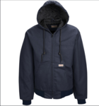 Red Kap Adult Blended Duck Zip-Front Hooded Jacket. Blend: Shell: 65% Polyester/35% Cotton Lining: 100% Polyester Insulation: 100% Polyester. *Insulation content may varyCare: Industrial Wash, Light Soil, or Home WashClosure: Full zipper frontCountry of Origin: ImportedFabric: 10 oz. DuckFeatures: Three-piece lined hood with adjustable togglesGored sleeve for comfortLined with black quilted liningMen's Fit Chart: MFC-12. Pocket: Two front pouch-style pockets with reinforced bartacks.