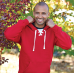 J America Adult 10.0 Ounce Sport Lace Fleece Hood. 10.0 ounce, 80/20% Ringspun Cotton/Polyester fleece fabric. Split front placket with 6 sewn eyelets. Spandex blend rib on waist, cuffs, and side gusset panels. Jersey lined 3-piece sport hood. Thick flat white drawcord with grey ticking (color laces available for purchase separately, see style 8831). Sport shoulder panel. May contain loop labels and tear away labels.