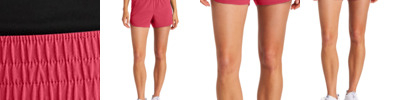 This sporty women's short with side pockets is ideal for any exercise or activity. 3.5-ounce, 90/10 polyester/spandex, 100% polyester tricot mesh inserts 3-inch inseam Snag-resistant Moisture-wicking Elastic waistband with drawcords Inner brief liner Side pockets Scallop-shaped side vents Front leg mesh panels
