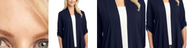 This lightweight, dual-color cardigan layers beautifully and has a timeless appeal. An open front and front and back seaming details at the waist give it sophistication.