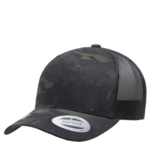 Yupoong Retro Multicam Trucker s Cap. 6 panel trucker s cap with 3 1/2 " crown, Trucker cap with officially licensed MultiCam pattern. Hard buckram. Matching plastic snapback closure. 60% Polyester/39% Cotton/1% PU Spandex. Alpine has a white undervisor and the others have a black undervisor.